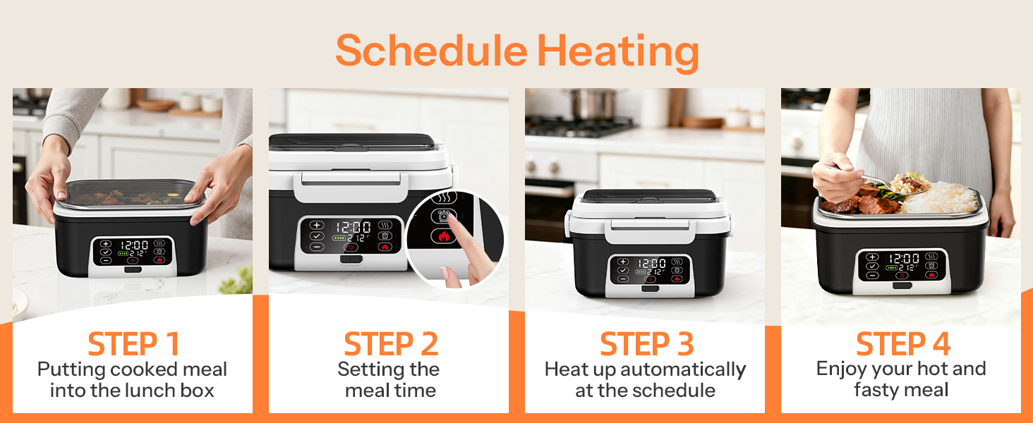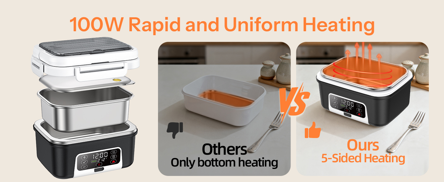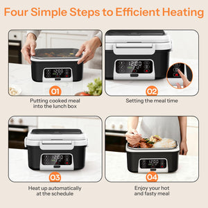 Features a programmable timing option that preheats your meal automatically before lunchtime, plus a direct heating mode for instant warming. Setting the local time is required for accurate scheduling.