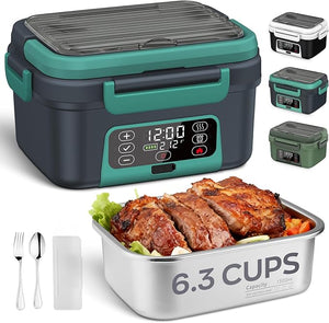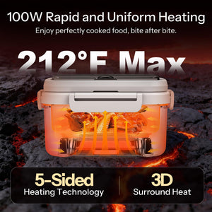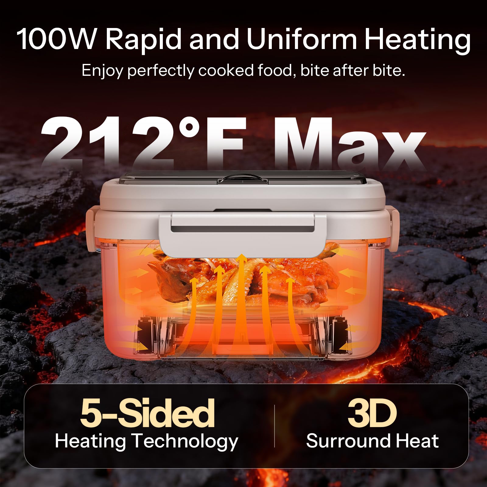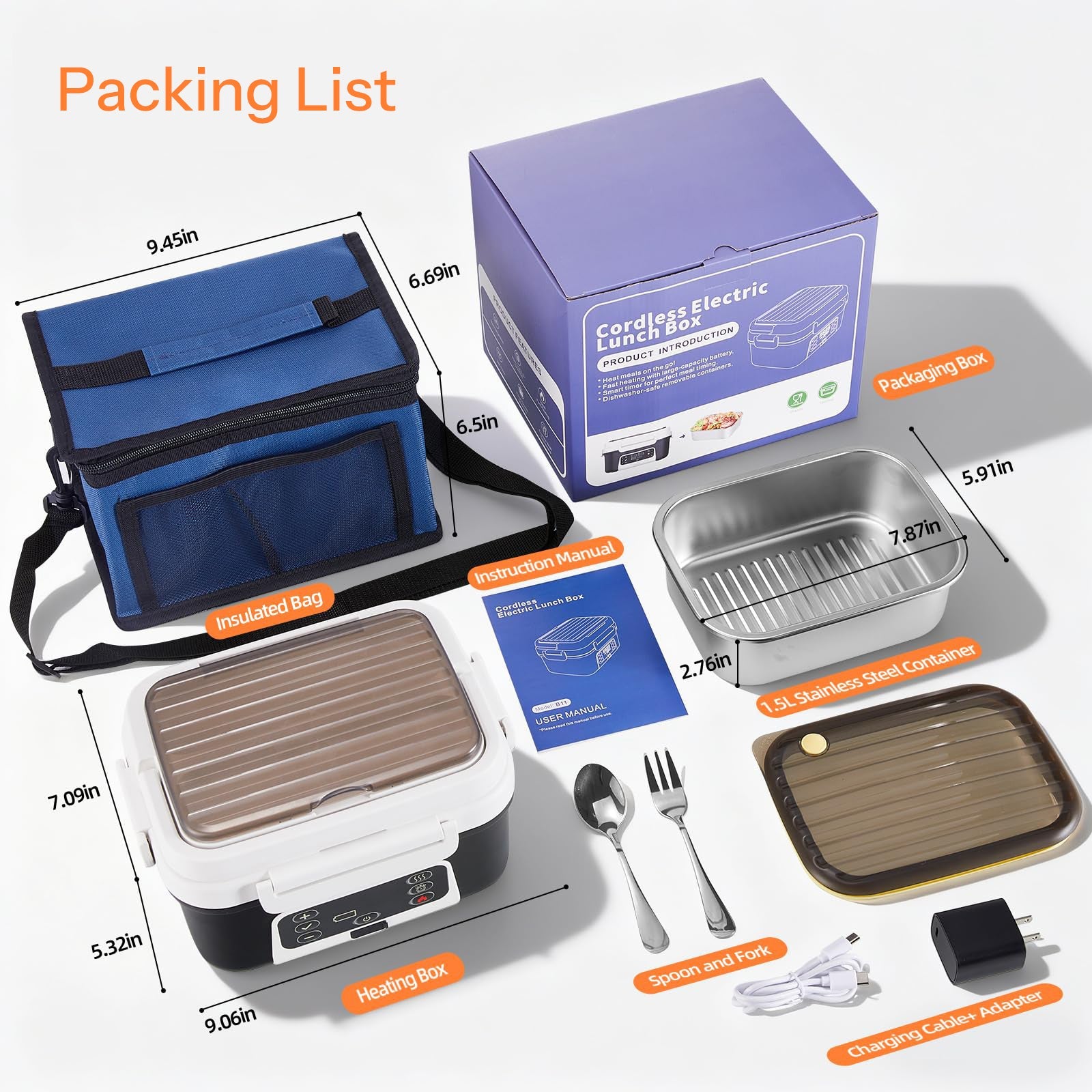 This cordless electric lunch box features a 6.3-cup capacity, a 100W heating system, and a 20000mAh rechargeable battery. It comes with utensils and an insulated carrying bag, making it suitable for adults who need warm meals at work, during travel, or outdoors.