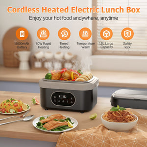 This 1.5L cordless electric lunch box for adults features automatic heating, an 18000mAh rechargeable battery, and a portable design with an insulated bag and tray divider—ideal for office, truck, and outdoor use.