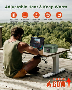 Equipped with a 16000mAh battery and 20W fast charging, this lunch box heats food without needing a power outlet and can also serve as a backup power source for small devices. -