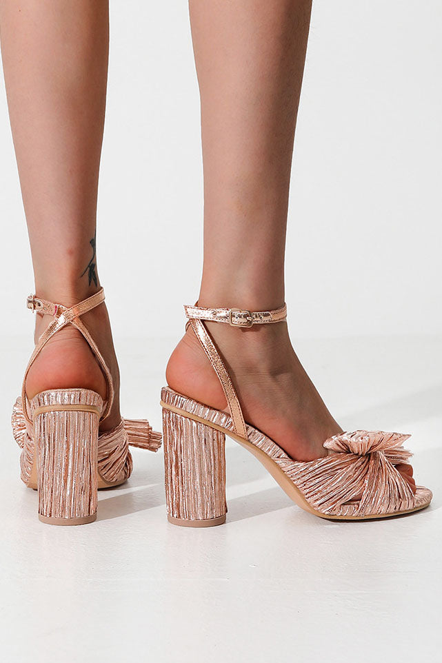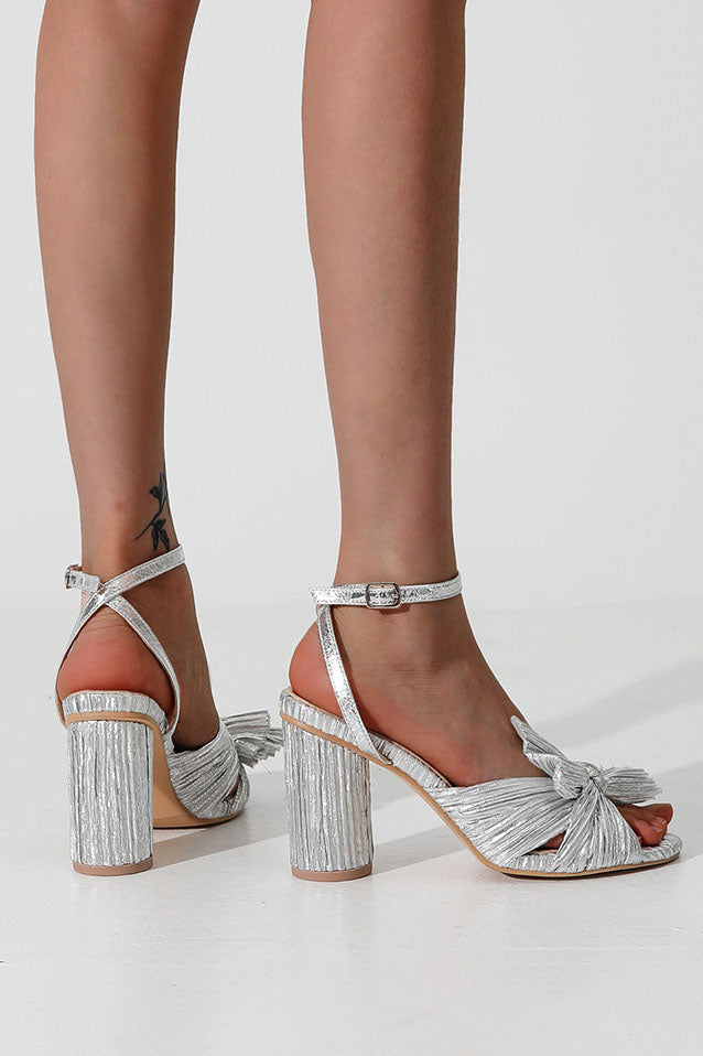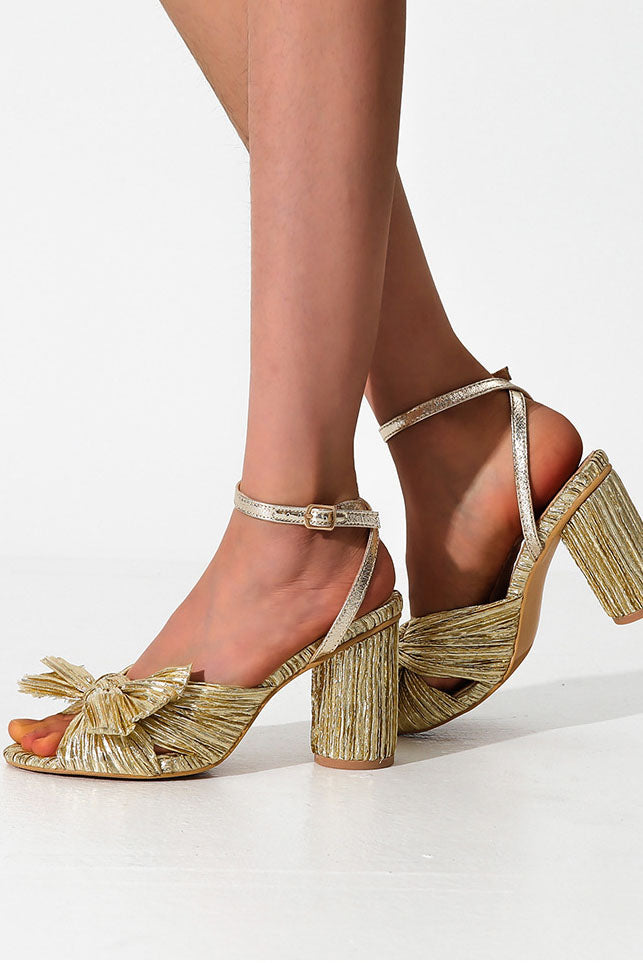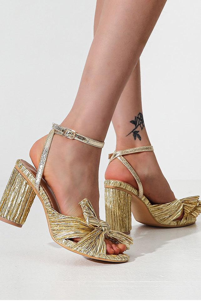 FEATURE: Crinkled lamé brings shimmer and texture to a fête-ready sandal featuring a wrapped column heel and an artfully knotted bow over the toe.