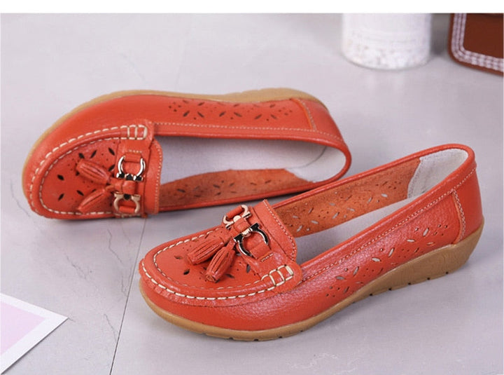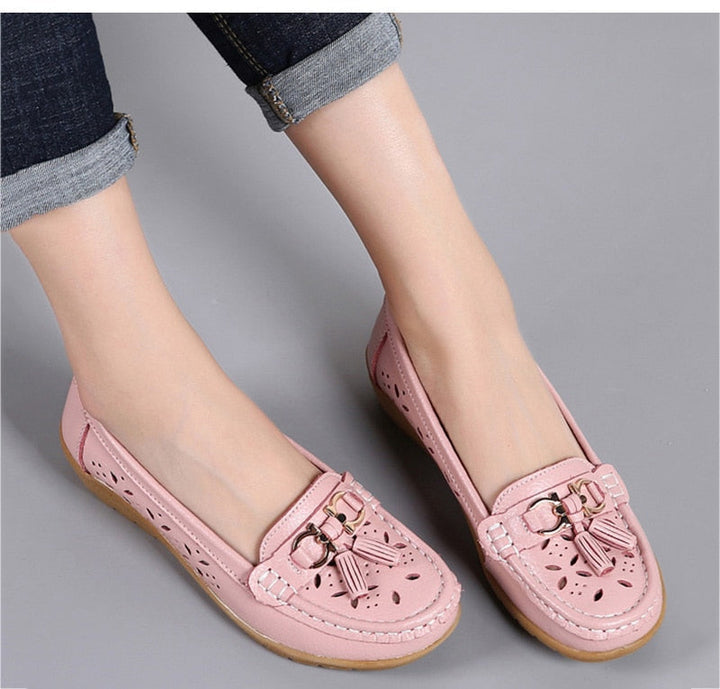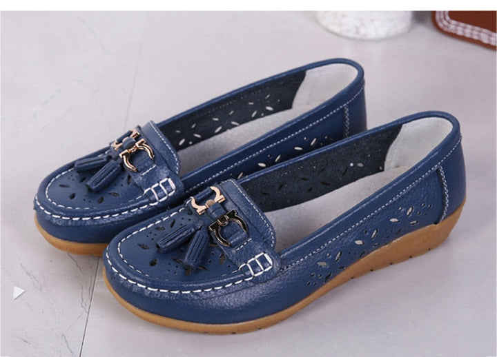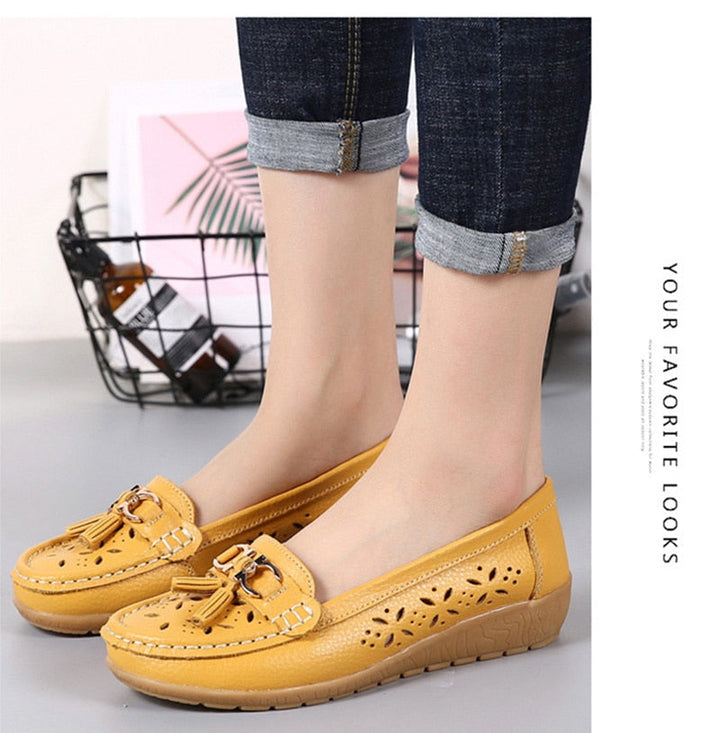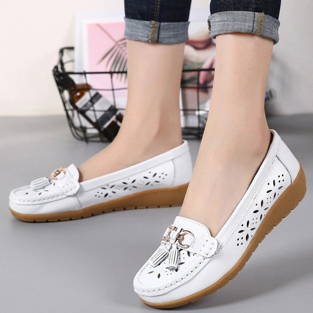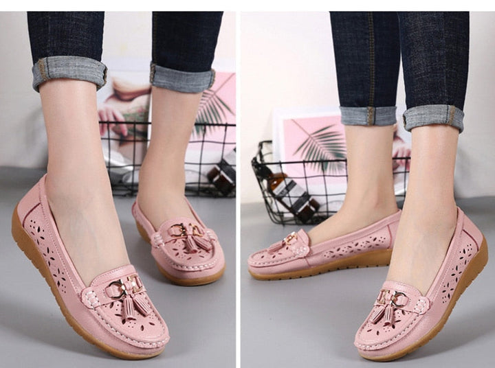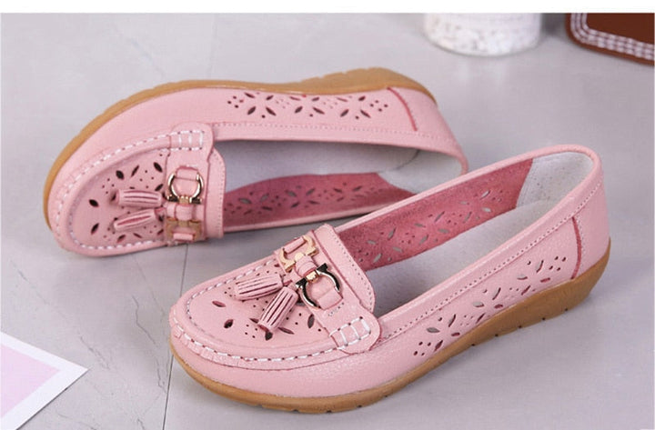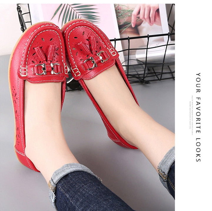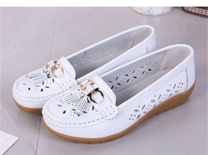 Breathable Leather Upper:The upper of the womens loafer is made of high-quality leather material,thanks to the hollow design,the casual slip on shoes has good breathability,suitable for summer and when going out.