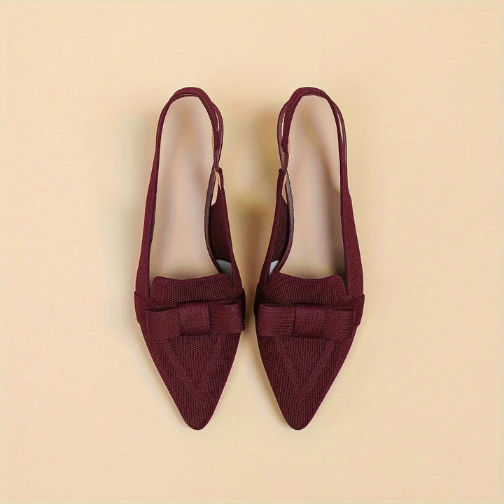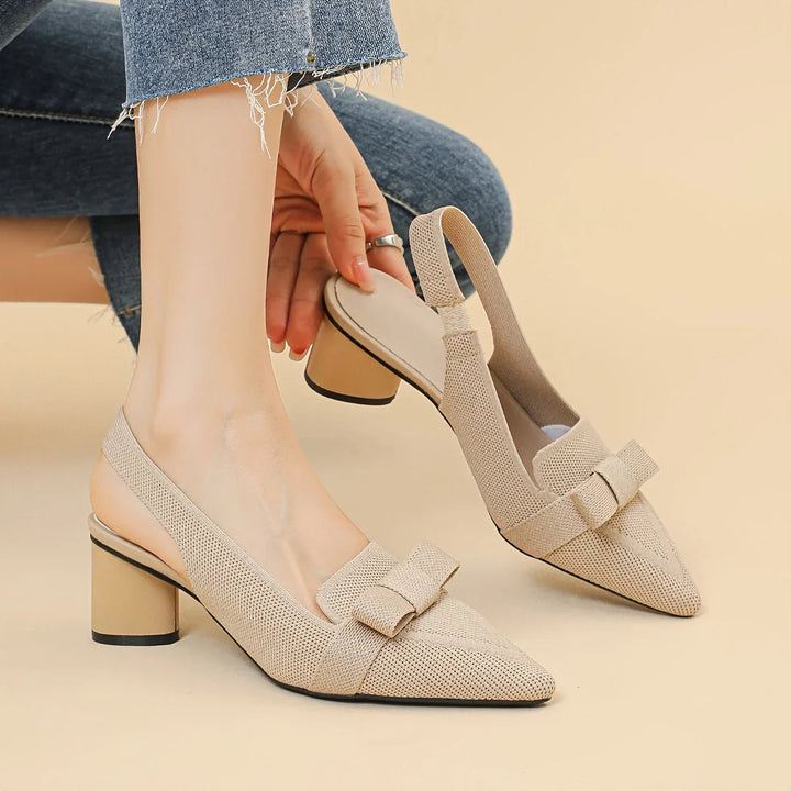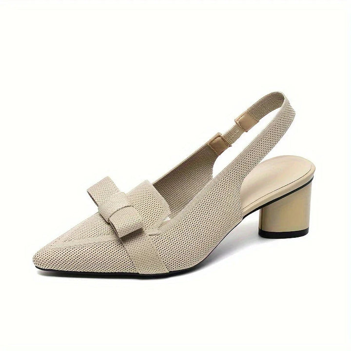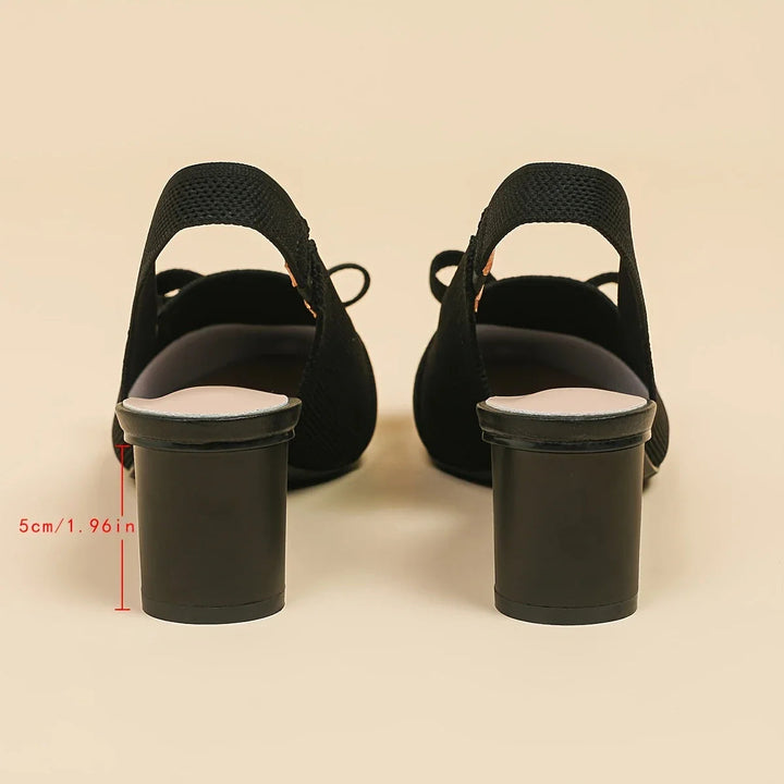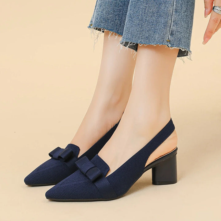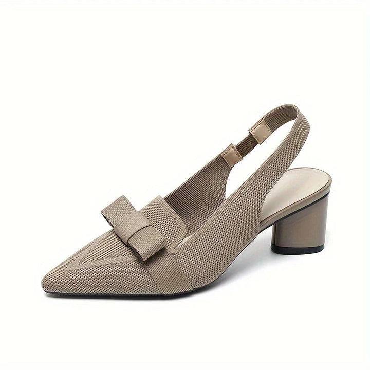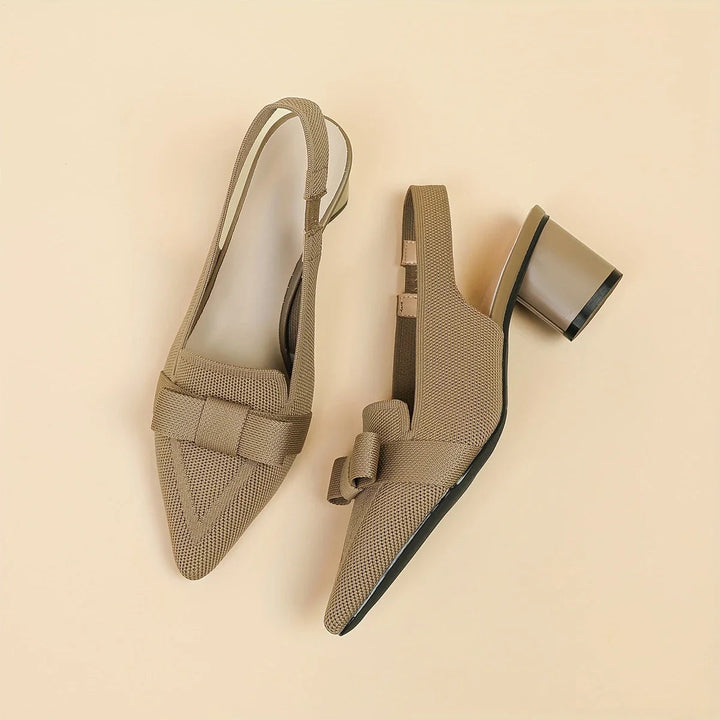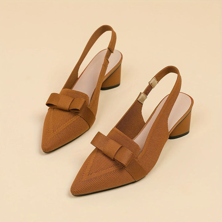 These pointed slingback heels feature a chic bow detail and a comfortable block heel for polished elegance . The mid-height heel provides stability , while the slim slingback strap ensures a secure fit.