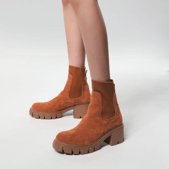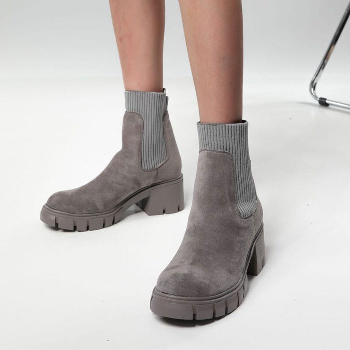 Flaunt your flawless fashion choices with the Chelsea suede ankle booties. Crafted with suede, ribbed knit and rubber, stand out in an elastic knitted gore paneled with suede trims, featuring a closed round toe, a cushioned footbed anchored by a rubber ridged outsole and a low-block heel, a slip-on styling trimmed with a pull-tab at the opening. Find more trendy women's sock boots and unique shoes in our boutique, and style them with a skirt matching set and a shoulder bag - Heel height: 4.5cm.