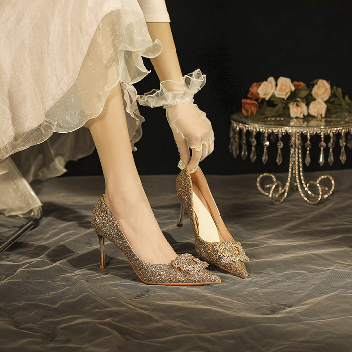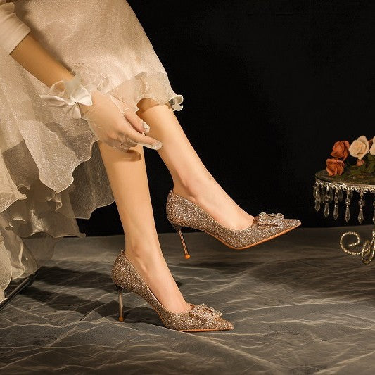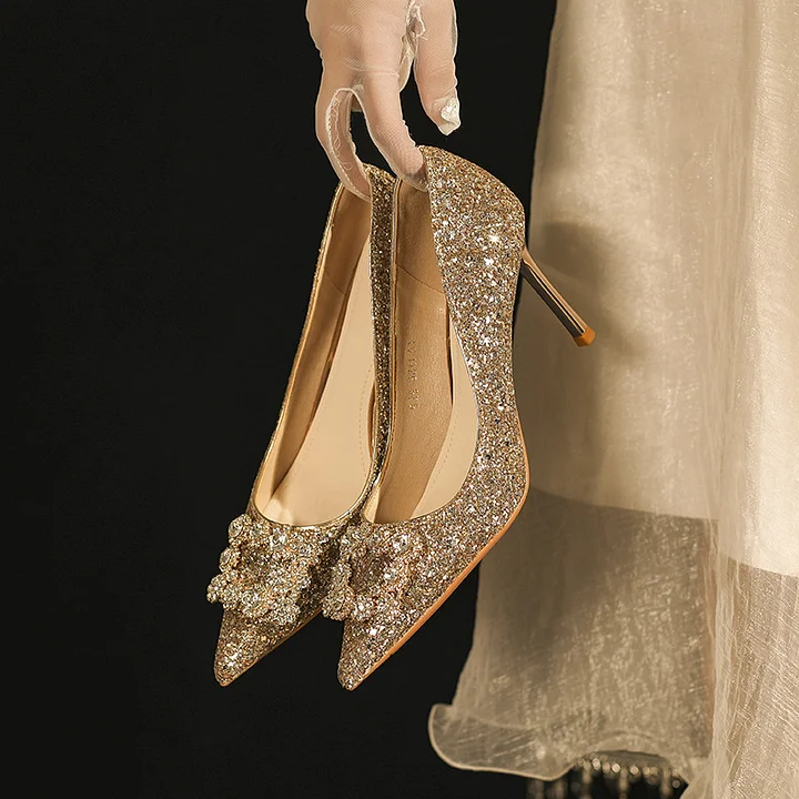 The polished metallic stiletto heel adds a modern edge, while the rhinestone embellishments provide a luxurious touch.
