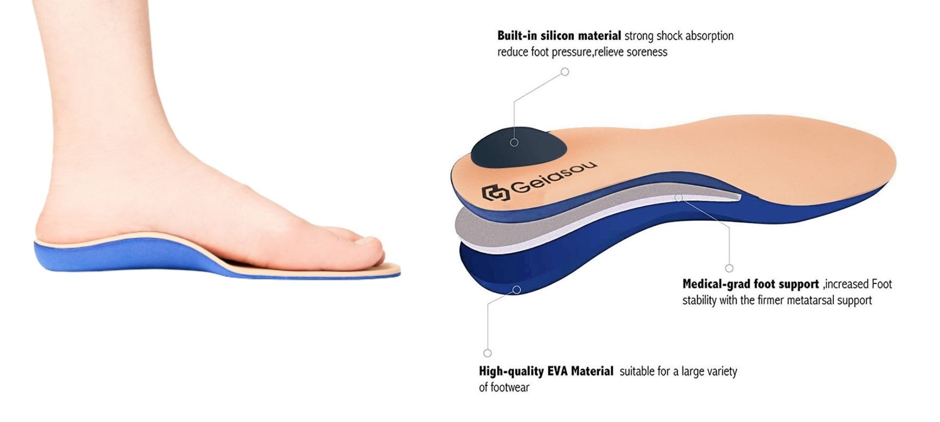 Premium orthotic insoles with anatomical arch support re-align the foot and body, easing the pain on the foot and heel, all the way up to your knees, hips, and lower back.