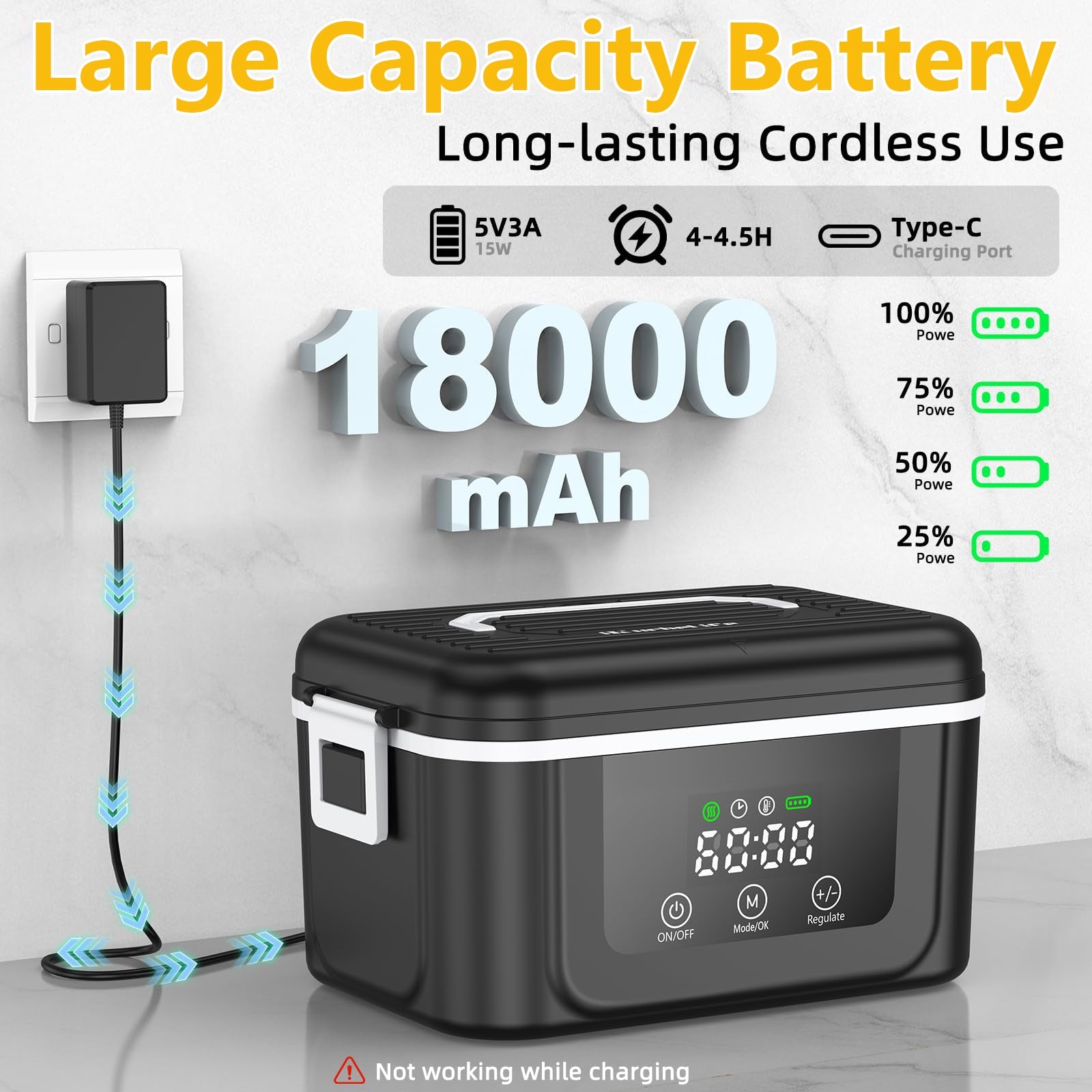 Built with an 18000mAh battery, this portable lunch box heats food without needing a power outlet—ideal for office, car, or outdoor use. -