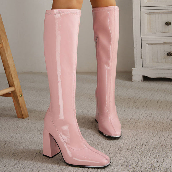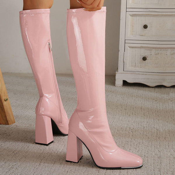 Making a stylish statement comes easy to the square-toe tall boots. Crafted with PU leather and rubber, stand out in a metallic faux leather design allover, featuring a square toe accented with a contrasting silver-tone welt, seamed stitching trimmings on upper, a tonal exposed side zipper, a cushioned footbed anchored by a covered chunky high heel and a rubber heel cap. Find more trendy women's knee-high boots and unique shoes in our boutique, and wear them on with a sexy dress and a houndstooth bag for an stunning look - Heel height: 10cm.