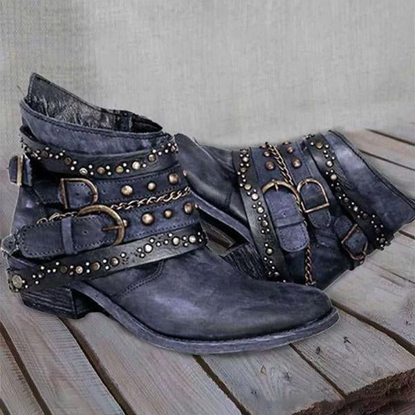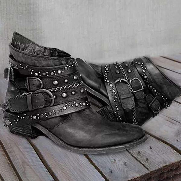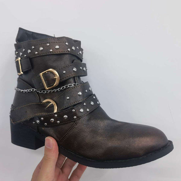 The sides of these shoes are embellished with studs and a belt buckle. A rivet is a metal ornament usually used to emphasize the texture and sturdiness of a shoe. The belt buckle is for decoration. These design elements add a sense of style and personality to the shoe.