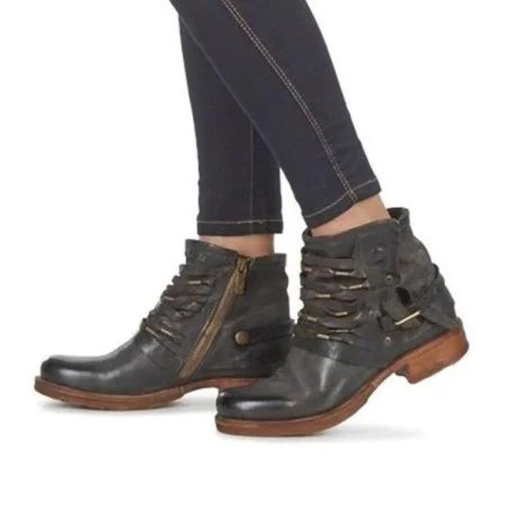 Boot Type: Platform Boots Fashion Element: Buckle Strap, Platform Closure Type: Zipper Toe Shape: Round Toe Boot Height: Ankle Outsole Material: Rubber Upper Material: PU Heel Type: Square Heel Heel Height: Low (1cm-3cm) With Platforms: Yes Season: Spring, Autumn, Winter Color: Blue, Gray, Black