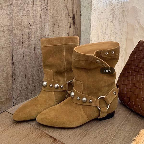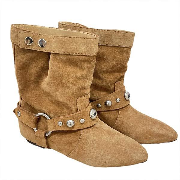 These women's Western cowboy boots feature a pointed toe and are adorned with stylish studs, giving them a rugged yet fashionable look. The low chunky heel provides comfort and stability, making them perfect for all-day wear. Ideal for adding a touch of Western flair to your outfit, these boots pair well with jeans, skirts, or dresses for a versatile and trendy addition to your wardrobe.